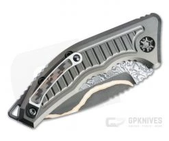 Robust and compact, the Heretic Medusa makes a great tactical everyday carry folder thanks to superb design, build, and materials. A simple, rock solid button lock mechanism activates a snappy coil spring mechanism for decisive and fast deployment, while the straight forward, ergonomically designed handle delivers a secure grip for utility or martial use. This custom version comes with a hand ground, Bakers Forge San Mai Damascus Tanto blade, “frag” milled DLC coated titanium handles, matching hardware and Copper Snakeskin Fat Carbon inlaid button and clip. S/N 019