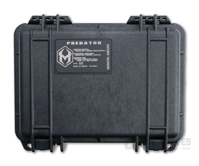 The Manticore-E is a mid-size, double action, out-the-front automatic built for daily carry. This highly limited custom set is Predator themed with the Manticore-E in two-tone Battleworn DLC and red camo carbon fiber paired with a Harding custom silver and garnet Predator bead lanyard, Blackside Customs themed lighter and custom 1120 Pelican hard case. S/N 072.