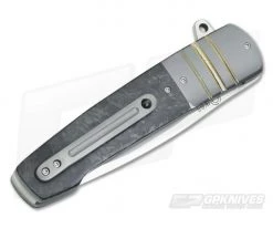 The Handle: Two thick bead-blasted titanium liners form the core of the knife body while also creating the easily maneuvered liner lock mechanism. Handsome smoky marbled carbon fiber handle scales meet absolutely seamlessly with decorative textured primary Zirconium bolsters, all affixed to the liners via stainless steel torx screws. A custom machined titanium pocket clip with ball bearing retention has been attached for right-hand tip-up carry.