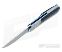 The Handle: Two thick blue anodized titanium liners form the core of the knife body while also creating the easily maneuvered liner lock mechanism. Handsome blue and silver lightning strike carbon fiber handle scales meet absolutely seamlessly with decorative textured primary stainless steel bolsters, all affixed to the liners via stainless steel torx screws. A custom machined titanium pocket clip with ball bearing retention has been attached for right-hand tip-up carry.