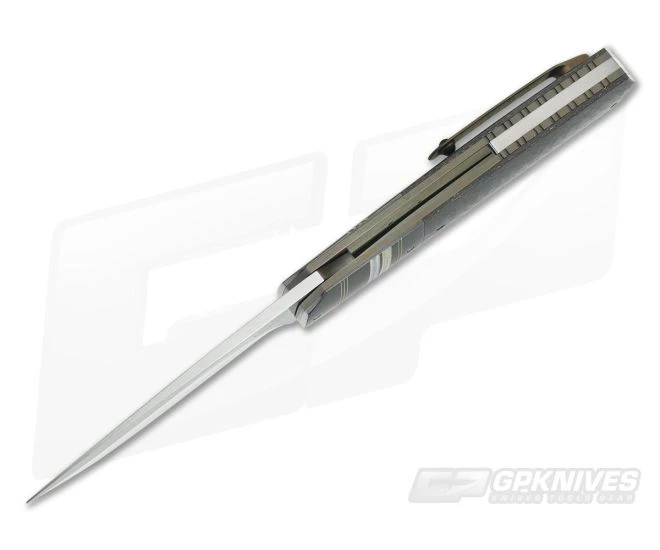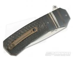 The Handle: Two thick bronze anodized and blasted titanium liners form the core of the knife body while also creating the easily maneuvered liner lock mechanism. Handsome bronze LS carbon fiber handle scales meet absolutely seamlessly with decorative textured primary zirconium bolsters, all affixed to the liners via stainless steel torx screws. A custom machined titanium pocket clip with ball bearing retention has been attached for right-hand tip-up carry.