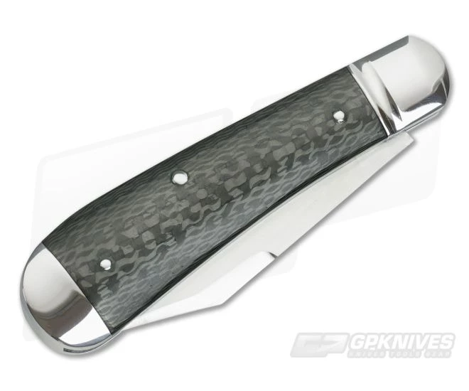 The Handle: Beautiful Carbon Fiber scales have received a smooth polished finish as well as slight contouring for in hand comfort. The scales are fit to stainless steel liners with 416 stainless steel pinned construction set perfectly between the two, integral, polished steel bolsters. The top bolster exhibits a decorative groove and the front scale is inlaid with a polished stainless steel rectangle shield.