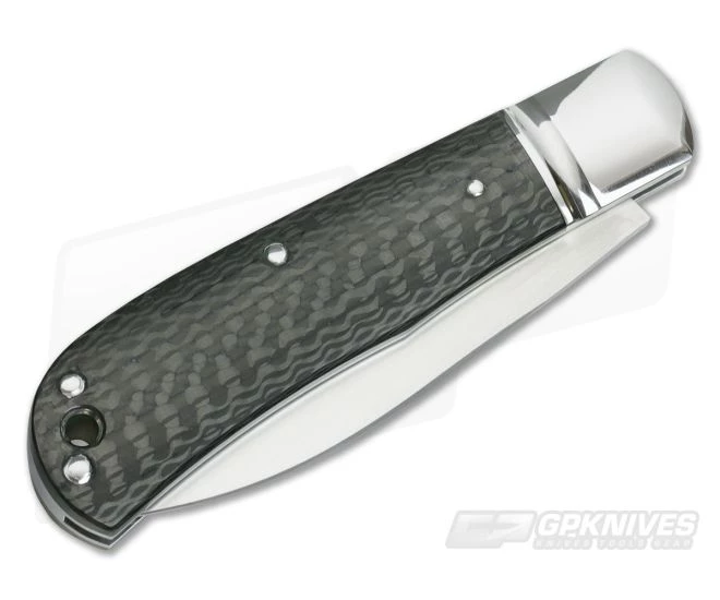 The Handle: Gorgeous Carbon Fiber scales have a smooth polished finish as well as slight contouring for in hand comfort. The scales are precision fit to stainless steel liners with 416 stainless steel pinned construction and polished stainless bolsters. The bolsters have a groove embellishment and the front scale is outfitted with a polished rectangular shield. A generous, flared tube is provided for lanyard attachment.