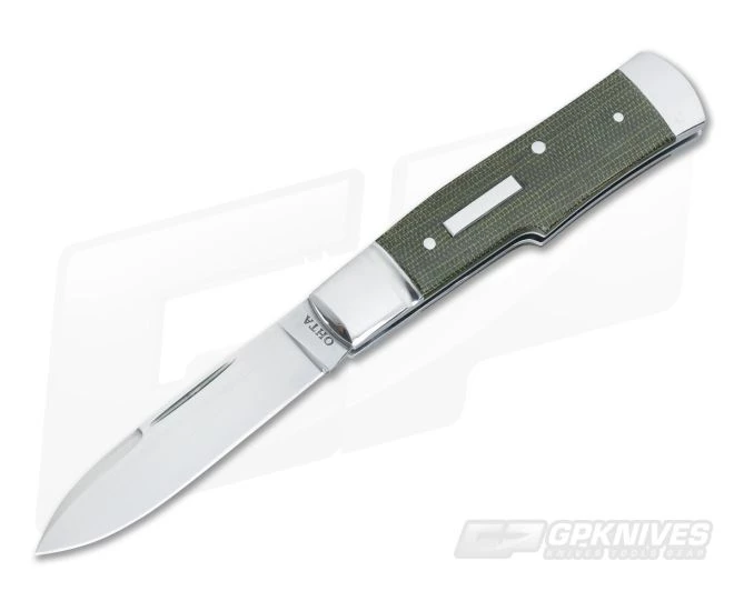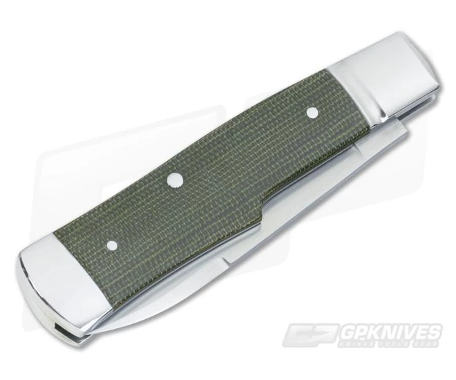 The Handle: Handsome green micarta scales have received a smooth polished finish as well as slight contouring for in hand comfort. The scales are form fit to stainless steel liners with 416 stainless steel pinned construction. Dual polished stainless bolsters and rectangular shield rounds out this beauty.