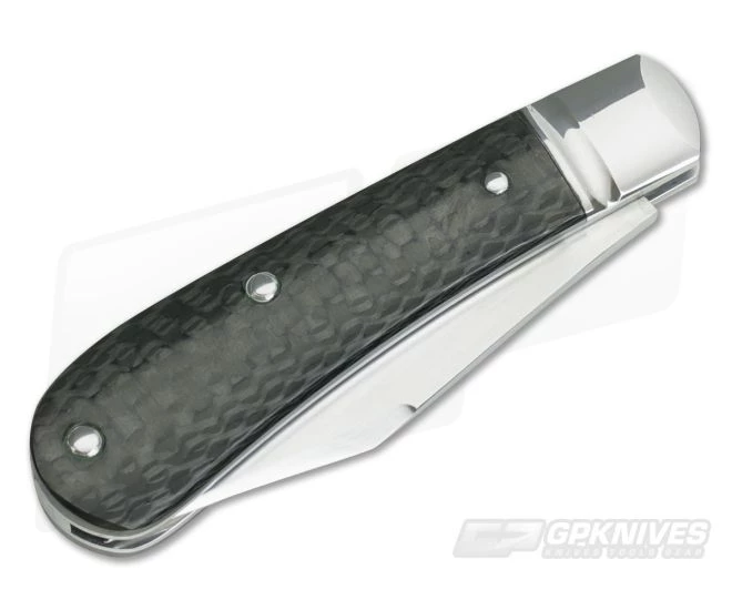 The Handle: Striking Carbon Fiber scales have a smooth, polished finish and subtle contouring for in-hand comfort. The scales are fit perfectly to stainless steel liners with 416 stainless steel pinned construction with polished stainless bolsters and a rectangular shield. The bolsters display a groove embellishment that further elevates this beautiful piece. The compact size of the #125 makes is a perfect choice for fifth pocket carry as a Gentleman’s knife.