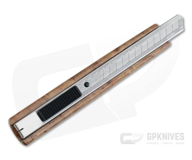 Japanese custom knife maker Hiroaki Ohta takes your standard snap blade utility knife and elevates it with a custom hard wood handle giving you the best of both worlds. Built on a stainless steel Tajima slide platform this version comes with a Burl Wood handle.