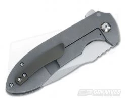 The Handle: Contoured titanium slabs form the handle with front divots for accent. Bead-blasted and then heavily tumbled for a dark gray appearance, the handles are secured together via a torx construction and blasted titanium backspacer. Bronze titanium pivot collar, titanium hardware, hidden lanyard pin and blasted carved titanium clip finish off the piece.