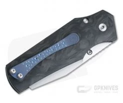 Handle: Clean and visually appealing lines are the cornerstone of Jason’s designs and the Rover is no exception. The ergonomics are superb despite the compact size and give the knife unparalleled security and control thanks to the well integrated finger choil and jimped spine scoop. The front gorgeous marbled carbon fiber scale has three skeletonized holes exposing the Raindrop pattern of the single blue titanium liner lock which is echoed on the pocket clip.