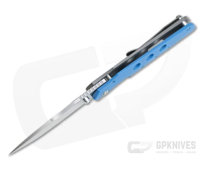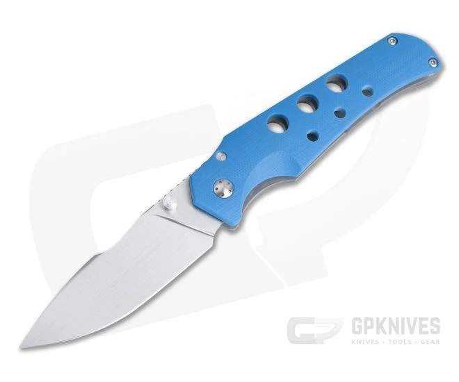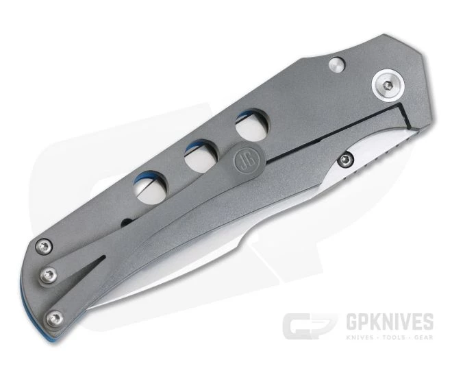 Handle: The clean, sweeping lines of the Scout make it visually appealing but the form is also functional. The ergonomics are superb and give the knife unparalleled security in-hand without the need for a large finger guard. The scoop on the spine places the thumb right over the pivot for increased power when cutting while the jimping delivers added security and traction. The classic Reeve Integral Lock is equipped with Mr. Guthrie’s proprietary tungsten insert. The GTI is fitted into the lock face and is incredibly hard, 90 HRC on the Rockwell scale, reducing lock wear greatly. The GTI lock is guaranteed against any lock wear that will induce lock rock or vertical blade play from normal use. This version comes with contoured Blue G10 & titanium handles with “show holes” for visual appeal and traction.