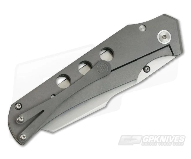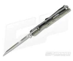 Handle: The clean, sweeping lines of the Scout make it visually appealing but the form is also functional. The ergonomics are superb and give the knife unparalleled security in-hand without the need for a large finger guard. The scoop on the spine places the thumb right over the pivot for increased power when cutting while the jimping delivers added security and traction. The classic Reeve Integral Lock is equipped with Mr. Guthrie’s proprietary tungsten insert. The GTI is fitted into the lock face and is incredibly hard, 90 HRC on the Rockwell scale, reducing lock wear greatly. The GTI lock is guaranteed against any lock wear that will induce lock rock or vertical blade play from normal use. This version comes with contoured handles with milled holes for weight reduction and traction. The lock side is full titanium while the front scale is a matte finished OD Green canvas micarta.