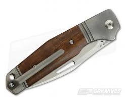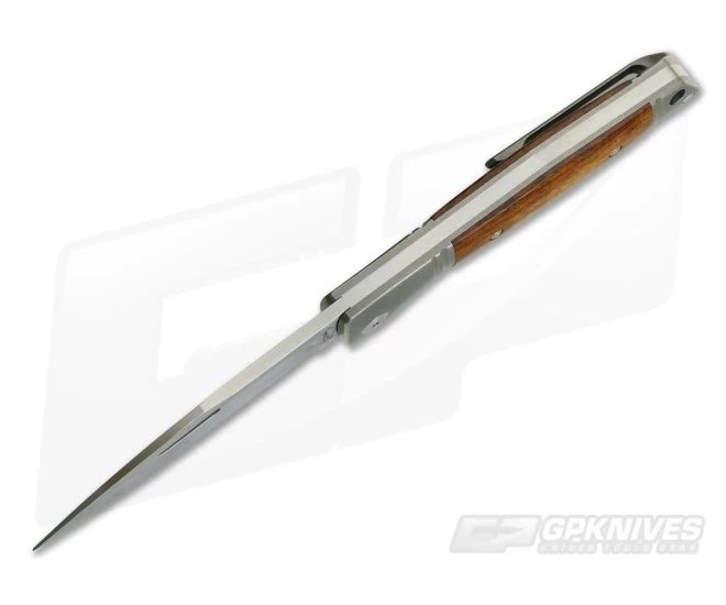 Handle: The full titanium handles are clean and ergonomic with a generous index guard, integral groove milled bolsters and handsome Desert Ironwood inlays that reduce weight and look great. The tumbled, blasted finish on the titanium provides a matte gray finish that is discreet for use. The stainless steel back spring delivers a snappy action opening and closing and a generous hole is included for lanyard attachment.