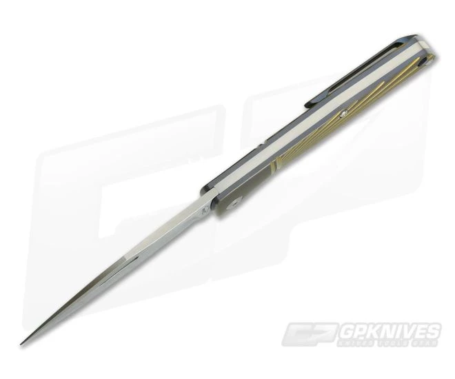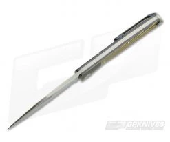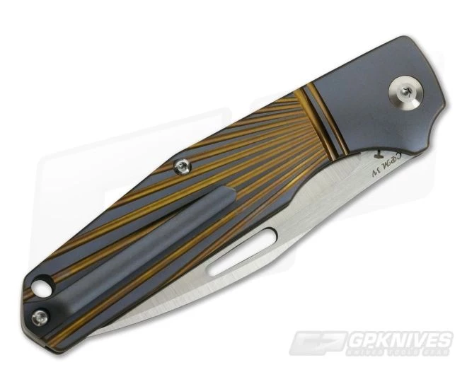 Handle: The full titanium handles are clean and ergonomic with a generous index guard, integral faux “bolsters” and a gorgeous Ray milling with a two tone finish: tumbled blue over gold with polished gold anodized grooves. Internally milled pockets significantly reduce weight with no sacrifice in strength. The stainless steel back spring delivers a snappy action opening and closing and a generous hole is included for lanyard attachment.