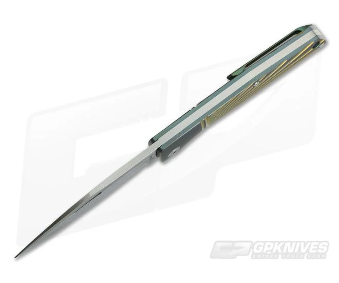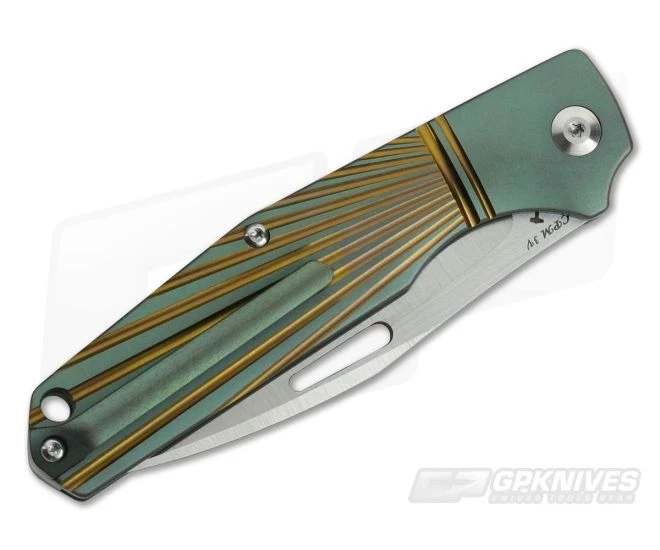 Handle: The full titanium handles are clean and ergonomic with a generous index guard, integral faux “bolsters” and a gorgeous Ray milling with a two tone finish: tumbled green over gold with polished gold anodized grooves. Internally milled pockets significantly reduce weight with no sacrifice in strength. The stainless steel back spring delivers a snappy action opening and closing and a generous hole is included for lanyard attachment.