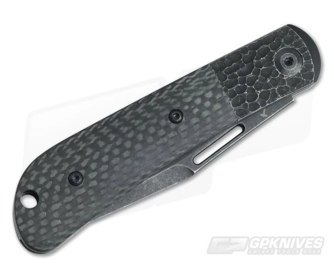 The Handle: The handles offer burly, jigged Titanium bolsters with integral titanium liners and contoured Carbon Fiber handle scales. A large Torx pivot and two Torx screws secure the handles together with a beefy, stainless steel back spring for secure and snappy operation. The bolsters and liners have a tumbled black coated finish for a rugged, subdued look. The back spring has a matching black tumbled finish that, along with the Carbon Fiber scales, makes this piece very discreet for carry and use. A large hole is provided for lanyard attachment.