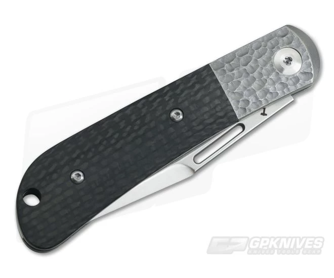 The Handle: The handles offer burly, jigged Titanium bolsters with integral titanium liners and contoured Carbon Fiber handle scales. A large Torx pivot and two Torx screws secure the handles together with a beefy, stainless steel back spring for secure and snappy operation. The bolsters and liners have a matte, bead blasted and tumbled finish for a vintage look with modern performance. The back spring is satin finished for a touch of class that accents the elegant Carbon Fiber scales. A large hole is provided for lanyard attachment.