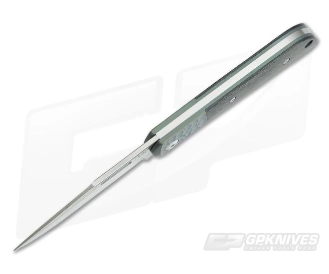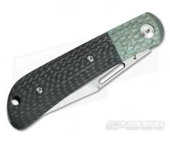 The Handle: The handles offer burly, jigged Titanium bolsters with integral titanium liners contoured Carbon Fiber handle scales. A large Torx pivot and two Torx screws secure the handles together with a beefy, stainless steel back spring for secure and snappy operation. The bolsters and liners have a Verdigris Bronze anodized finish for an aged, vintage look. The back spring is satin finished for a touch of class that accents the elegant Carbon Fiber scales. A large hole is provided for lanyard attachment.