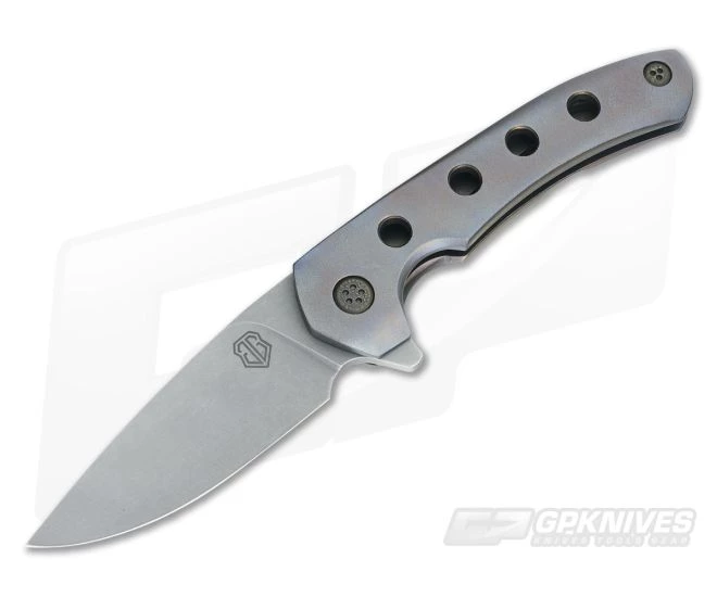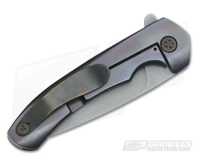 The Handle: Thick titanium handle slabs have been slightly contoured, chamfered and multi-tone orange peel anodized. Four round holes lighten and accent the front scale. Custom bronze hardware and full length carbon fiber backspacer give the knife an elegant appearance and solid build. Frame lock lower for reliable lock-up.