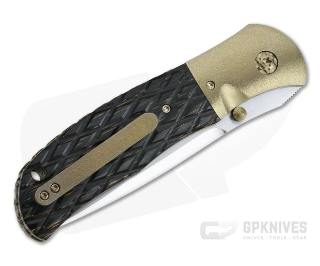 Handle: Gold anodized and orange peel textured titanium is used for bolsters, liners and clip complementing the handsome, diamond textured black palm wood scales. A matching back spacer rides proud to the liners for a more contoured feel and features custom file work for a high-end look. Take a peek inside the liners, and you will see they are engine turned, a truly custom detail. The simple liner lock delivers solid and secure lockup and is scalloped for traction in operation. Custom gold titanium hardware completes the construction.