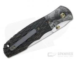 Handle: Anodized titanium liners and hardware complement the premium, diamond textured black palm wood scales. The matching file worked back spacer rides proud to the liners for a more contoured feel pairing with finger grooves for solid traction. Marbled carbon fiber bolsters dovetailed to the scales and engine turned jeweling inside the liners are truly custom details that provide plenty of visual appeal. The simple liner lock delivers solid and secure lockup and is scalloped for traction in operation.
