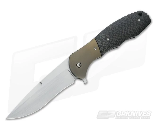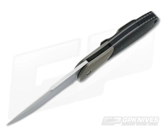 The Handle: Soft, bronze anodized bead blasted titanium make up the liners, with one forming the solid lock up. The one that does lock has some custom notching to easily push the liner over and close the blade. On top are equally blasted/anodized titanium bolsters and copper wire lightning strike carbon fiber scales pair together nicely. The ergonomics on this one is off the charts comfortable. Notching on the butt end of the handle adds to the overall feel in-hand as well. All titanium hardware was used on this piece including a tip up carry pocket clip. A perfectly formed black micarta backspacer rounds out construction.