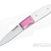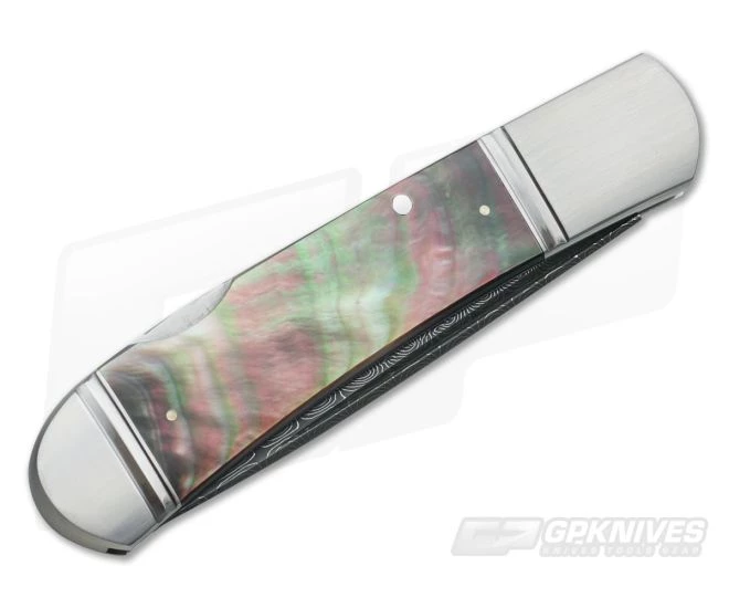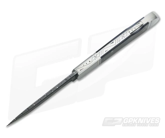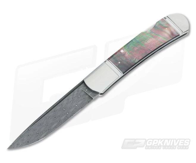 This Ken Steigerwalt Custom Folder features Black Lip Pearl handles and an all new Ponzio stainless Turkish pattern damascus blade. The stunning black lip pearl scales are accented by a 416 stainless steel frame with carved borders. The blade is deployed via a nailnick and snapped into place with a lockback lock. Ken’s signature logo can be found on the inside of the Deco style hand-filed backspacer. This knife is brand new directly from custom knife maker Ken Steigerwalt.
