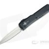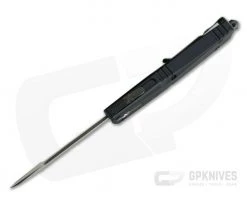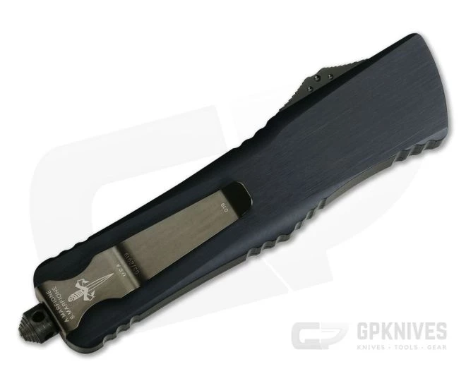 Marfione Custom Combat Troodon Compound Ground Clip Point out-the-front automatic knife is a substantial tool, popular among military, law enforcement and first responders. This knife is slender enough to keep on your person daily while the Apocalyptic two-tone DLC blade appeals directly to collectors. The Troodon is named after a bird-like dinosaur from the Campanian Age and is ready to strike. This custom version comes with ringed DLC hardware and satin, anodized, hefted alloy handles.