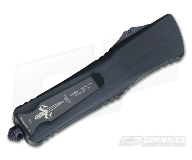 Marfione Custom Combat Troodon Interceptor out the front automatic knife is a substantial tool, popular among military, law enforcement and first responders. This knife is slender enough to keep on your person daily while the Hattori CX/Core Damascus blade appeals directly to collectors. The Troodon is named after a bird-like dinosaur from the Campanian Age and is ready to strike.