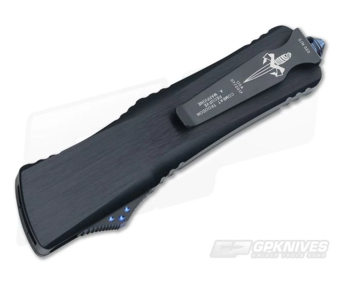 Marfione Custom Combat Troodon Interceptor out the front automatic knife is a substantial tool, popular among military, law enforcement and first responders. This knife is slender enough to keep on your person daily while the Mirror Polish blade appeals directly to collectors. The Troodon is named after a bird-like dinosaur from the Campanian Age and is ready to strike.