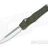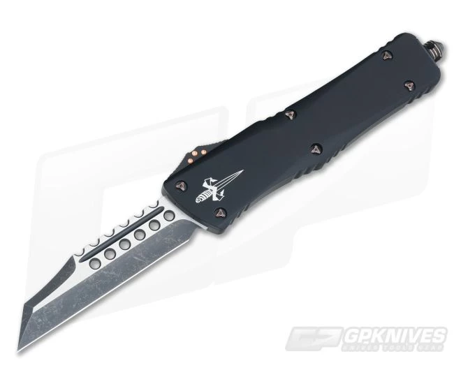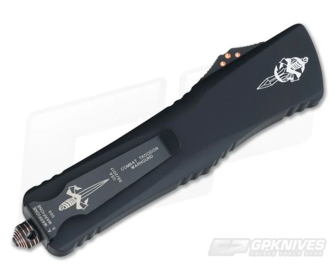 Marfione Custom Combat Troodon Warhound out the front automatic knife is a substantial tool, popular among military, law enforcement and first responders. This knife is slender enough to keep on your person daily while the two-tone Dark Matter blade appeals directly to collectors. The Troodon is named after a bird-like dinosaur from the Campanian Age and is ready to strike.
