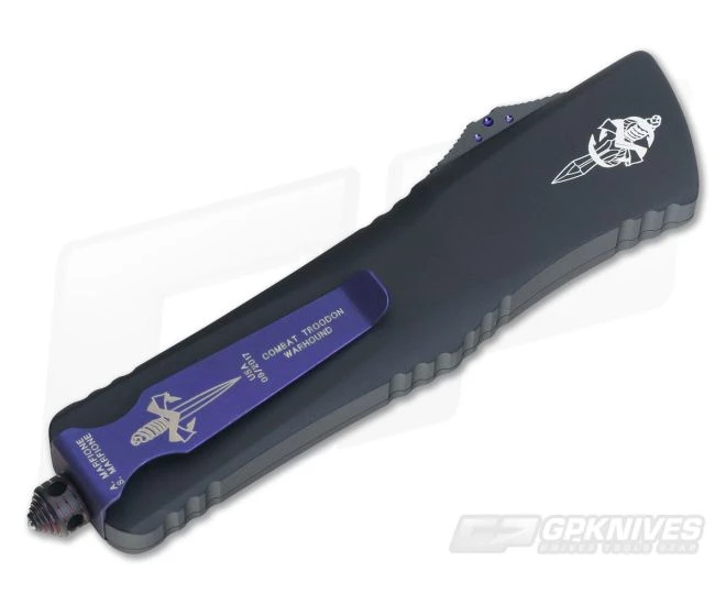 Marfione Custom Combat Troodon Warhound out the front automatic knife is a substantial tool, popular among military, law enforcement and first responders. This knife is slender enough to keep on your person daily while the two-tone DLC blade appeals directly to collectors. The Troodon is named after a bird-like dinosaur from the Campanian Age and is ready to strike.