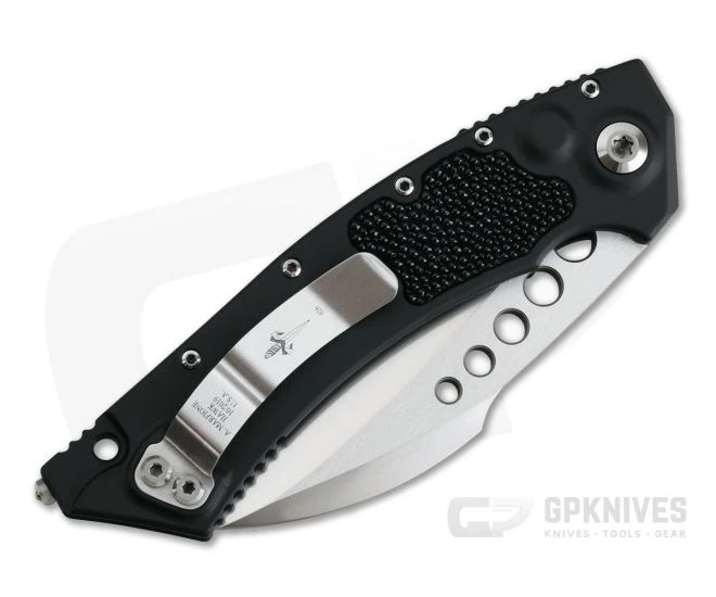 The Microtech Hawk Auto revives the iconic 1996 design with 21st Century updates and aesthetics for a sleeker finish and increased functionality. This Marfione Custom Knives version features a hand rubbed satin, CTS-204P Hawkbill karambit blade, Black anodized aircraft grade aluminum handles with Stingray Skin Inlays and Two-tone satin finished hardware. S/N 016.