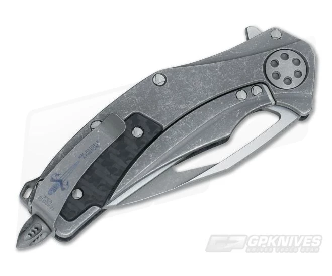 The Handle: The handle of the Marfione Mini Matrix R consists of a fully machined carbon fiber front scale with a contoured and Apocalyptic titanium lock side. A subtle carbon fiber overlay has been precision fit just below the pocket clip and adds even more of a cool factor to the knife. Marfione’s trademark tri-wing screw construction and skull crusher pommel are present along with a deep carry titanium pocket clip etched with the knife’s birthdate.