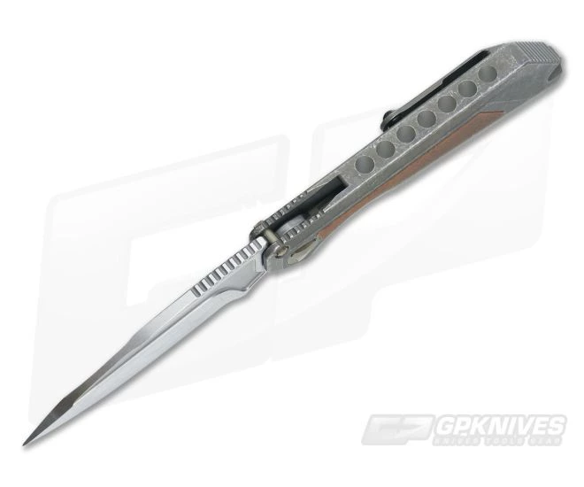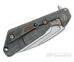 The Handle: Created from a single billet of 6Al4V titanium, this integral handle has an end of days Fallout finish that continues on to the copper inlays. SnG-styled for excellent style and feel in hand with comfy ridges and divots abound. Complete with all bronzed hardware including the solid frame lock’s insert tab. The copper stabilizer ring is a nice touch as well as the inlay in the pocket clip. Killer design between these two where no detail was left behind. Inside the handle you will find the Customs dagger, A. MARFIONE, 06/2017 MSG-3.5, USA and the Serial #023.