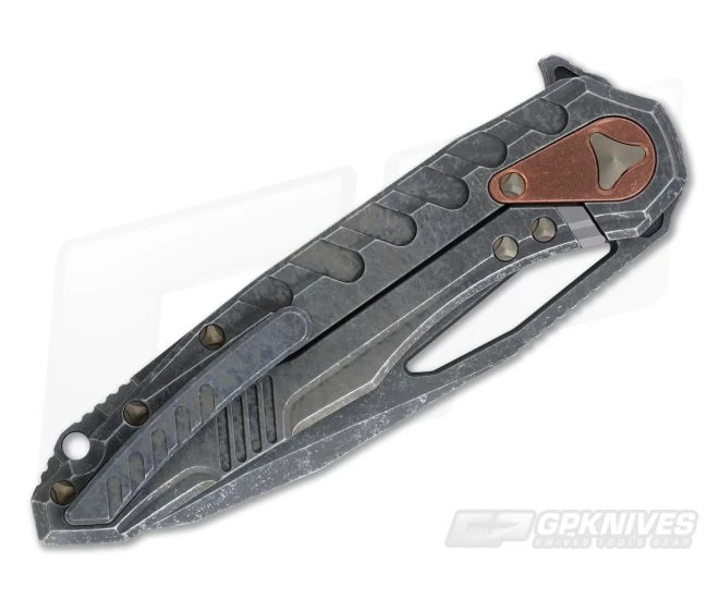 The Handle: Like most of Deryk Munroe’s knives, this one has tons of detail in the handle with extra machining done to get the details just right. The 6AL4V titanium features the new Fallout finish and is accented with bronzed hardware. There is a copper plate to prevent lock overtravel, replaceable lock face and fully milled titanium clip all of which follow the knife’s theme.