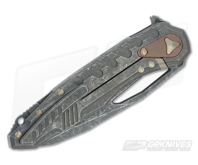 The Handle: Like most of Deryk Munroe’s knives, this one has tons of detail in the handle with extra machining done to get the details just right. There is a copper plate to prevent lock overtravel, replaceable lock face and fully milled titanium clip all of which follow the knife’s theme.