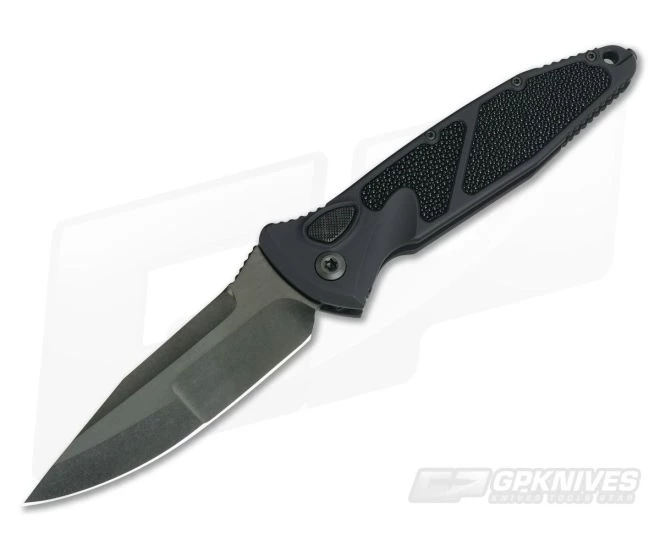Blade: This Custom Socom Elite sports the same beefy 4-inch blade of high performance M390 stainless steel but has been black DLC (Diamond Like Carbon) coated and compound ground: hollow saber up front and mid-height hollow in the back. The flats are satin while the grinds and swedge are tumbled for a subdued two-tone look. The blade rockets out decisively when deployed via the large textured button powered by the automatic coil spring mechanism.
