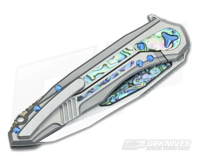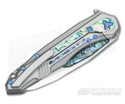 The Handle: Like most of Deryk Munroe’s knives, this one has tons of detail in the handle with extra machining done to get the details just right. The 6AL4V titanium is double vapor blasted and accented with blue titanium hardware and lots of colorful abalone. There is an abalone plate to prevent lock overtravel, replaceable lock face and fully milled titanium clip all of which follow the knife’s theme. Finished with a flamed backstrap serialized #008.