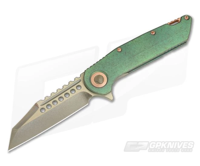Marfione Custom Warhound flipper is a substantial tool built on a 6AL4V Titanium Frame Lock platform. This Warhound is a beefy tool with some serious heft thanks in part to the full length copper backspacer and hardware accents. This custom flipper comes with a Two-Tone Bronze M390 blade and Antique Green anodized titanium handles and clip.