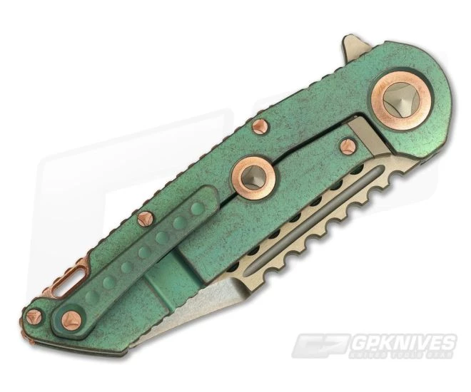 Handle: The 6AL4V Titanium Frame Lock construction is subtly contoured with chamfered edges for optimal comfort. Strategic jimping on the handles along with the full length jimping on the copper backspacer offer excellent traction. The Antique Green anodized finish is tumbled exposing the copper undertones which are highlighted by the copper pivot collar, over travel stop, hardware and backspacer. A hardened steel lock face delivers smooth, reliable operation on this massive flipper. Inside the frame the backspacer is marked with both Marfione’s logos and names along with “014 08/2018 U.S.A.”.
