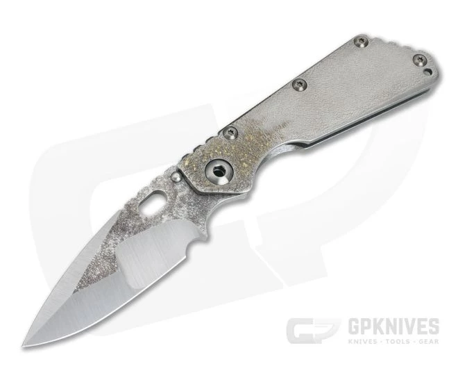 Blade:Â The Spear Point CPM 20CV blade is two-tone finished with machine satin on the dual hollow grinds and “Manhattan Project” texture on the flats and spine. The shallow hollow grinds and false edge top delivers unstoppable piercing capability while a deep hollow primary grind ends in a razor sharp edge for optimal slicing performance. The top of the spine has jimping that extends to the frame enhancing traction. The blade opens smooth on phosphor bronze washers via the oval blade hole. The iconic Strider choil is signed M. Strider.Â