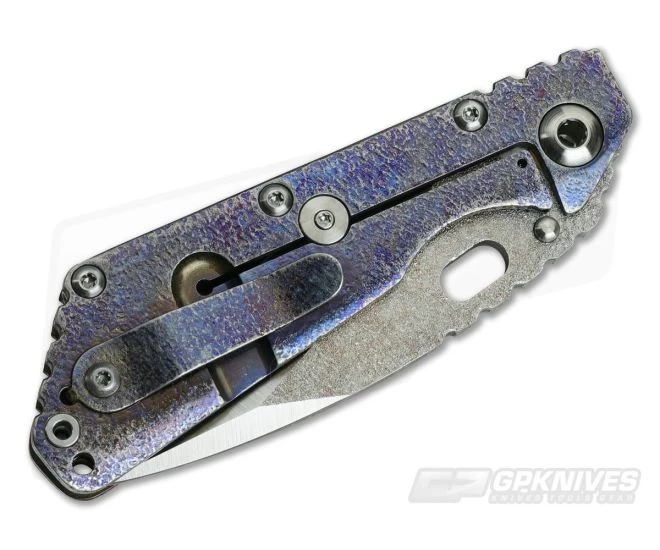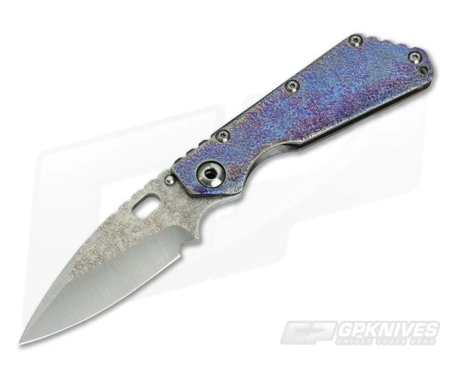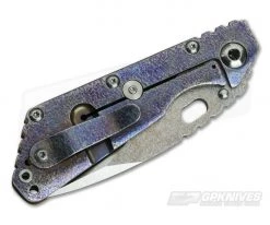 The Strider SMF is a full-sized tactical folder that is ready to dish out some unstoppable cutting performance. This Mick Strider Custom SMF has standout visual appeal while still retaining the battle tested design that makes the SMF what it is. This unique SMF Custom comes equipped with a two-tone, dual-hollow ground, 20CV Spear Point blade and organic textured, multi-color anodized full titanium frame lock construction. Comes complete with a padded nylon zipper pouch with SMF rocker patch for carry and storage.