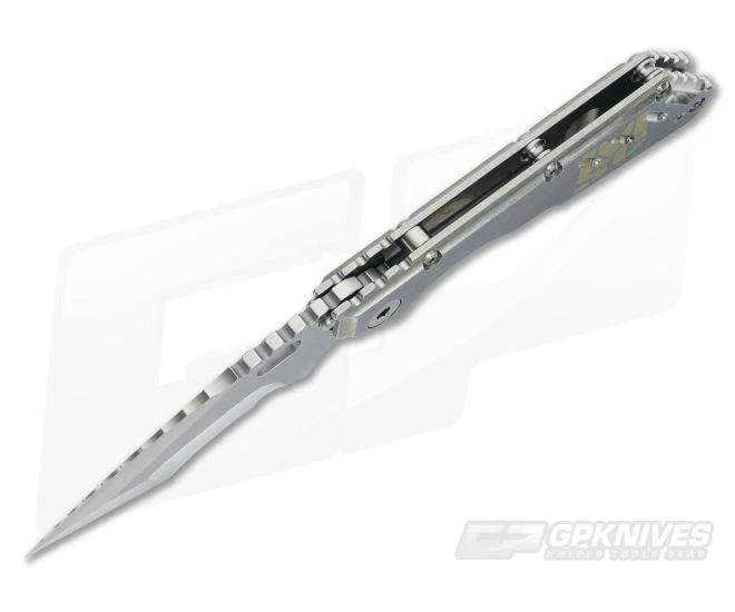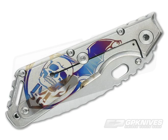 The Handle: It doesn’t get more Ti than this all-titanium construction. We’re talking handle frame, screws, standoffs even the lockbar stabilizer and pivot! How about the massive closed stop pin you ask? Yes! Absolutely it’s titanium. This beast is hardcore and then some, folks. The entire frame is heavily stonewashed with the MSC logo laser engraved on the front. Lock up is early and rock solid. More laser engraving on the back of Mick’s winged skull logo that matches up with the pocket clip. Notching on the top and end add grip. The XL concludes with a lanyard slot ready to personalize.