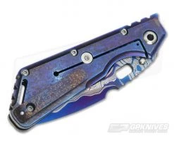 The Handle: Over 5 inches of textured, Magic Mick anodized glorious titanium with carefully grooved edges and textures galore. It’s a spectacular combination of bronze/blues/purples you have to see in person to fully appreciate. It’s that cool. Construction on this beast consists entirely of titanium. Oversized Ti barrel spacers, hardware and internal “closed” blade stop. The pivot bolt construction is now titanium as well. It works in conjunction with thick phosphor bronze washers to create that silky action. The XL also utilizes the Hinderer Lockbar Stabilizer to prevent over-extension of the bar. A 3/4 inch slot is cut from the bottom to allow for lanyard customization.