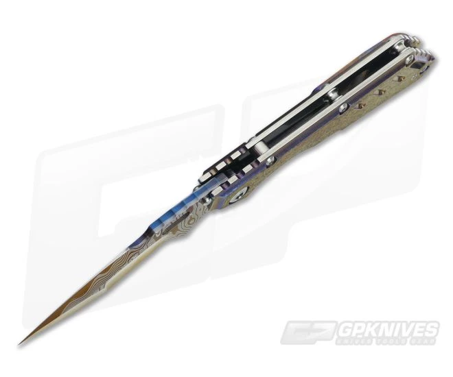 The Blade: Mick crafted this one into a piercing shape with deep belly that offers wicked intimidation and collector appeal. The precision, patience and technique that goes into every blade is absolutely astonishing for a knife lover. This one features an aggressive point with nightmare grinds from some blue dipped, homemade san mai. A long thumb ramp with subdued notching blends into a faux top edge. It operates smoothly via an ambidextrous oval window cutout of the flat with small blade stop protrusions. The choil is signed M. Strider.