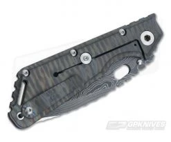 The Blade: Mick is known for his “Nightmare Grind” as it is as breathtaking as it is exhausting to pull off. The precision, patience and technique that goes into every one is absolutely astonishing for a knife lover. This one is folded and folded, then folded again into a Nightmare Tanto with a recurve. Mick has created a San Mai Damascus with Stellite 6K alloy core. Wow! A long thumb ramp with familiar deep Strider notching blends into one of the coolest spines you’ll ever see known as Mick’s dragon scale scallops. These light bumps run down the length of the blade all the way to the tip and are reminiscent of the spine or back of any pre-historic reptilian or fantastic creature from classic stories told. It operates smoothly via an ambidextrous oval window cutout of the flat with small blade stop protrusions.