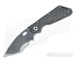 The Blade: Mick is known for his “Nightmare Grind” as it is as breathtaking as it is exhausting to pull off. The precision, patience and technique that goes into every one is absolutely astonishing for a knife lover. This one is folded and folded, then folded again into a Nightmare Tanto with a recurve. Mick has created a San Mai Damascus with Stellite 6K alloy core. Wow! A long thumb ramp with familiar deep Strider notching blends into one of the coolest spines you’ll ever see known as Mick’s dragon scale scallops. These light bumps run down the length of the blade all the way to the tip and are reminiscent of the spine or back of any pre-historic reptilian or fantastic creature from classic stories told. It operates smoothly via an ambidextrous oval window cutout of the flat with small blade stop protrusions.