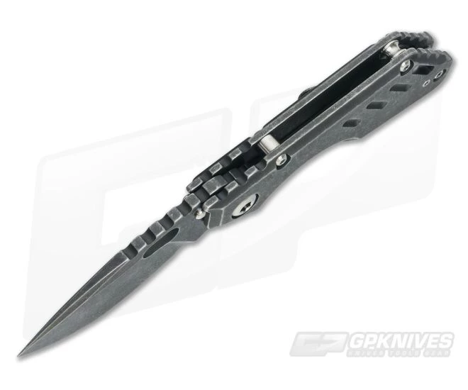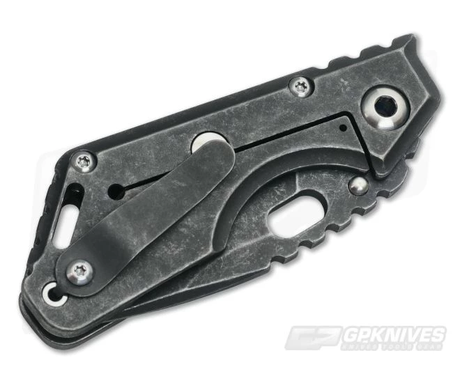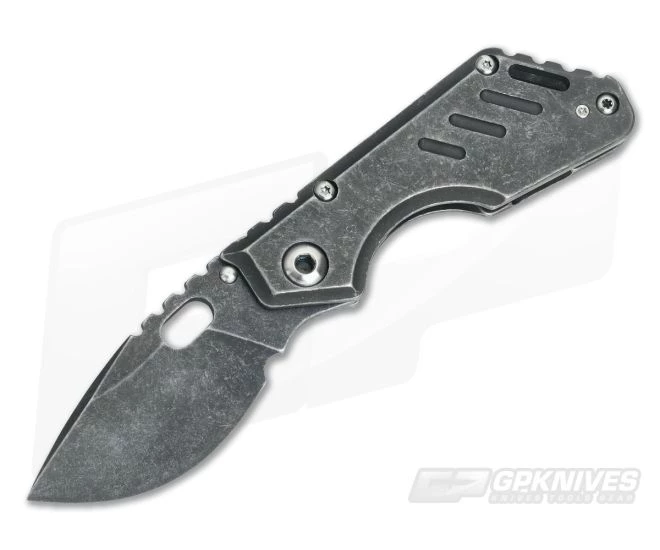 The Mick Strider Performance Series Stub with vintage finished Titanium is a big bellied beast with a sleek asymmetrically ground slicer blade and a stubby titanium handle. Open standoff construction and contoured handle lends itself to discreet pocket carry and also feels nice in the hand.