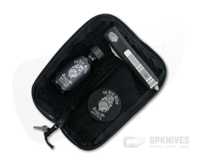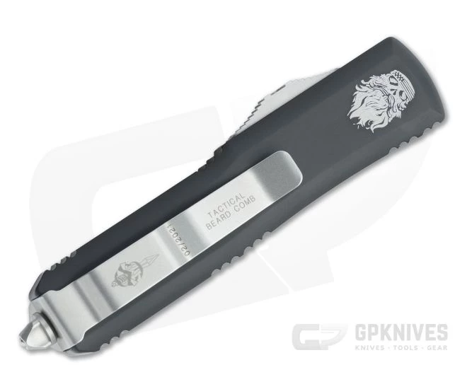 Microtech Knives have gotten together with the folks over at The Real McCoy Beard Oil to produce the Tactical Beard Comb! This is a UTX-85-size, dual action, out-the-front automatic comb that is every day carry friendly and just as fun to fidget with. This version has Black contoured handles and a stonewashed finish, stainless steel, fine tooth comb “blade”.