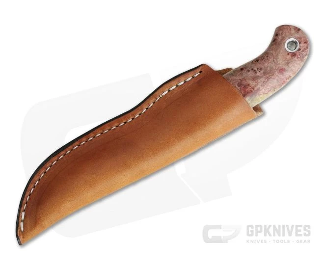 Handle: Simple and ergonomic are perfect words to describe the handles of the Irie 110. The subtle guard, generous palm swell and birds beak pommel help secure the knife in your grip while still allowing for the knife to be comfortable in multiple grips and easily maneuverable for a variety of tasks. This piece comes with polished Black Linen Micarta bolsters and a beautiful, stabilized, Dyed Maple Burl wood handle. A large, polished stainless steel tube is provided for lanyard attachment.