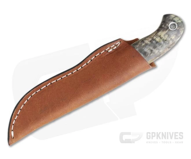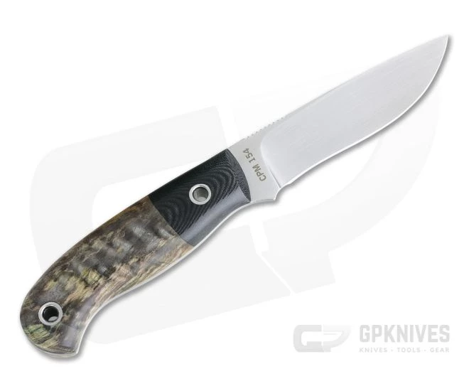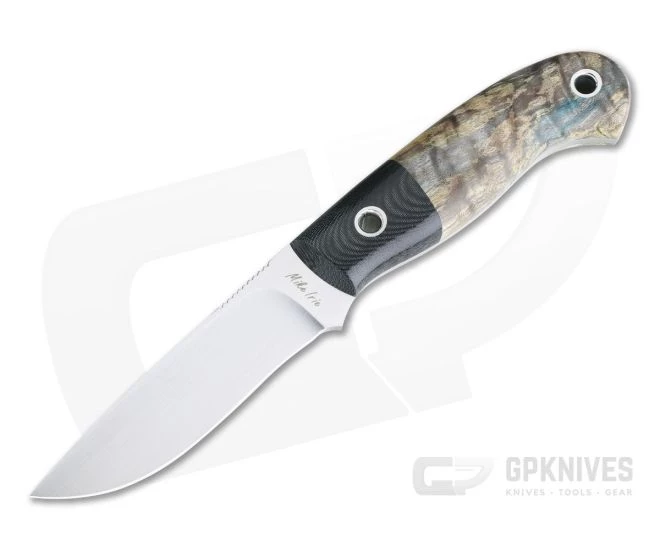 The Mike Irie Custom Model 110 lightweight Hunter is an ideal size for hunting, woodcraft or daily carry or as a mid-sized fixed blade for any collection. Mike Irie is renowned for his hand ground blades and his Custom Model 110 showcases his skill and attention to detail. This piece comes with a hand rubbed satin finished blade of CPM-154, polished black G10 bolsters and Stabilized Maple Burl Wood handles.